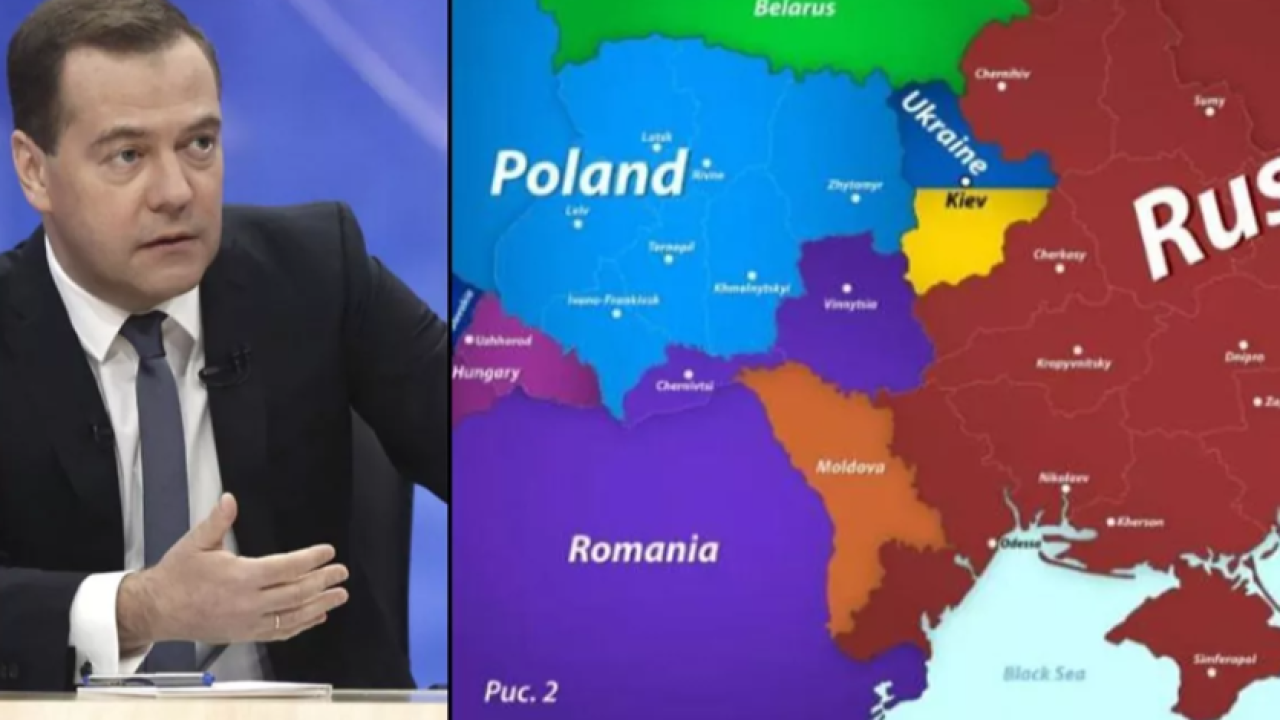 Medvedev, Ukrayna topraklarının çoğunun Rusya, Polonya, Romanya ve Macaristan arasında bölüşüldüğü Avrupa haritasını yayınlayarak, Batılı analistlerin böyle bir gelecek beklediklerini vurguladı.