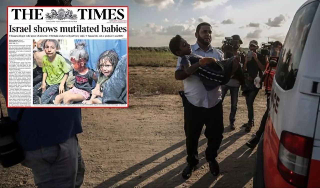 İngiliz "The Times" gazetesinin "İsrail, parçalanmış bebekleri gösterdi" manşetiyle verdiği haber, Filistinli yaralı çocukların fotoğrafıyla verildi.