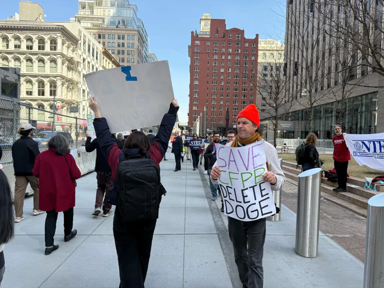 ABD’nin New York şehrindeki ABD Başkanı Donald Trump yönetiminin tasarruf tedbirleri çerçevesinde işten çıkardığı çalışanlar ve onlara destek olmak isteyen çok sayıda kişi, Federal Plaza önünde gerçekleştirdikleri protesto gösterisinde, Hükümet Verimliliği Departmanı'nın (DOGE) başındaki Elon Musk’a yönelik "Musk’ı Kov" yazılı pankartlar taşıdı.