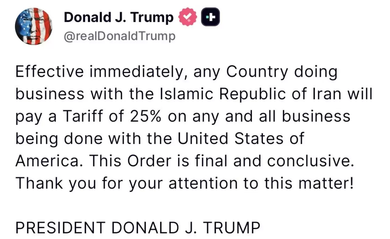 Kararı Truth Social üzerinden duyuran Trump, "Derhal yürürlüğe girmek üzere, İran İslam Cumhuriyeti ile iş yapan herhangi bir ülke, ABD ile gerçekleştirdiği her türlü ticari faaliyette yüzde 25 gümrük vergisi ödemekle yükümlü olacaktır" ifadelerini kullandı.