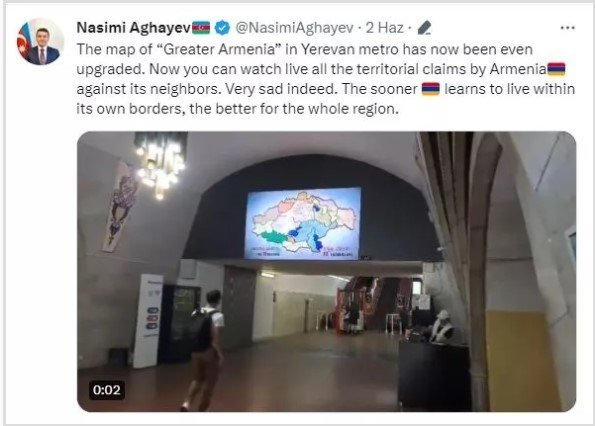Azerbaycan'ın Berlin Büyükelçisi Nasimi Aghayev, konuyu daha önce de dile getirmişti. Yapılan değişikliği fotoğraflarıyla birlikte Twitter hesabından paylaşan Aghayev, "Erivan metrosundaki 'Büyük Ermenistan' haritası güncellendi" demişti. Aghayev "Gerçekten çok üzücü. Ermenistan yönetimi kendi sınırları içinde yaşamayı ne kadar erken öğrenirse, tüm bölge için o kadar iyi olur" ifadelerini kullanmıştı.