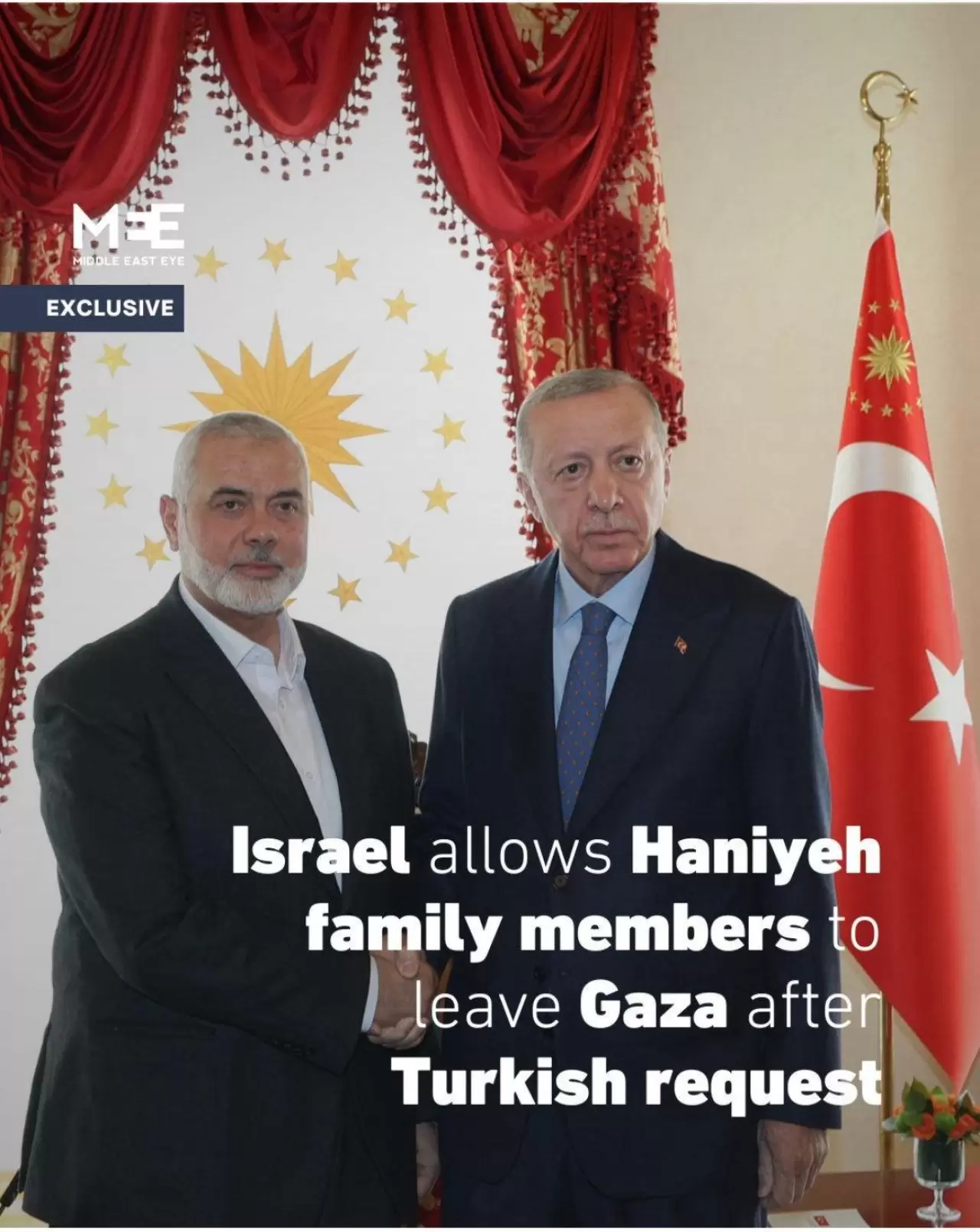 Türkiye'nin işgalci İsrail'den Hamas lideri merhum İsmail Haniye'nin ailesinden 16 kişinin de bulunduğu grubun güvenli bir şekilde Gazze Şeridi'nden ayrılmasını talep ettiği ileri sürüldü.