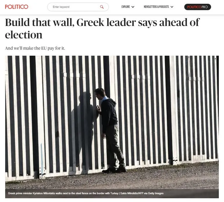 Yunanistan seçimlerini mercek altına alan ABD merkezli Politico dergisi, Miçotakis'in Seçim vaadi olan 'Türkiye ile olan kara sınırının tamamına duvar örme sözü'ne dikkat çekti ve "Yunanistan Başbakan Kiryakos Miçotakis, 2026 yılına kadar çitleri Yunanistan'ın Türkiye ile olan 192 kilometrelik sınırının neredeyse tamamını kapsayacak şekilde uzatma sözü verdi. Yunan Başbakan ayrıca Avrupa Birliği sınırının korunması maliyetini tek başına ülkesinin karşılamaması gerektiğini savunarak AB'nin finansman sağlamasını istedi" ifadelerini kullandı.