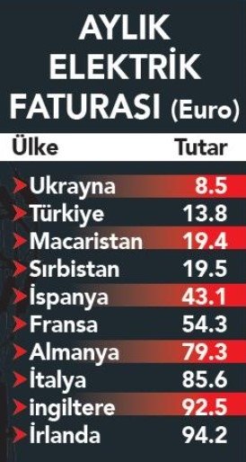 Enerji Bakanlığı verilerine göre, konutlarda aylık 200 kWh tüketime karşılık gelen fatura tutarına göre, Ukrayna 8.5 euro ile en ucuz ülke konumunda bulunuyor. Bu sıralamada Ukrayna'yı 13.8 euro ile Türkiye, 19.4 euro ile Macaristan izliyor. En pahalı fatura 94.2 euro ile İrlanda'da görülürken, bu ülkeyi 92.5 euro ile Birleşik Krallık takip ediyor.
