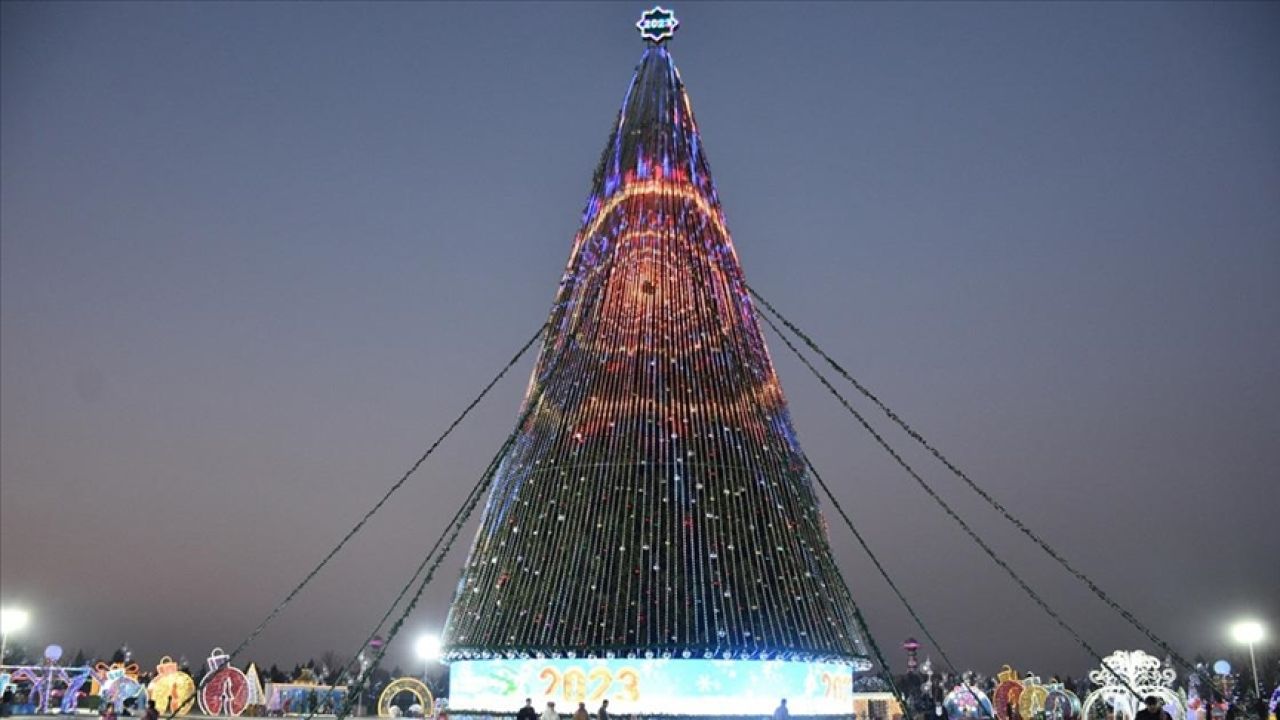 Yeni yıl ağacının ışıkları yakılırken, vatandaşlar ağacı görmek için bölgeyi ziyaret ediyor.