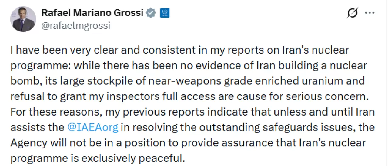 Uluslararası Atom Enerjisi Ajansı (UAEA) Başkanı Rafael Grossi, İran’ın nükleer faaliyetlerine ilişkin sosyal medya hesabından değerlendirmelerde bulundu.