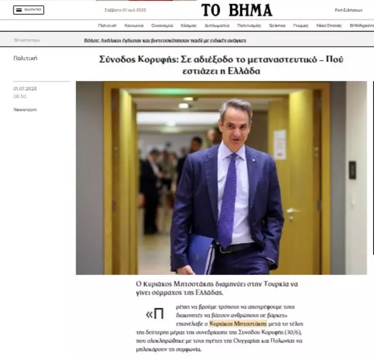 To BHMA gazetesi, iki liderin 11 Temmuz'da Vilnius'ta yapacağı görüşmeden önce Miçotakis'in verdiği yakınlaşma mesajının önemine dikkat çekti ve Yunanistan'ın bu görüşmeyi Türkiye ile ilişkileri geliştirmek için bir fırsat olarak gördüğünü yazdı.