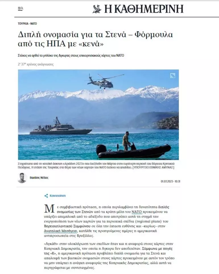 Kathimerini'nin kaynaklarına göre, ABD'nin teklifi ile İstanbul ve Çanakkale Boğazları'na çift isim verilerek, Kuzey Kıbrıs Türk Cumhuriyeti'nin referansı siliniyor ve KKTC NATO tatbikatlarını tanımlayan koordinatlarla tarif ediliyor.
