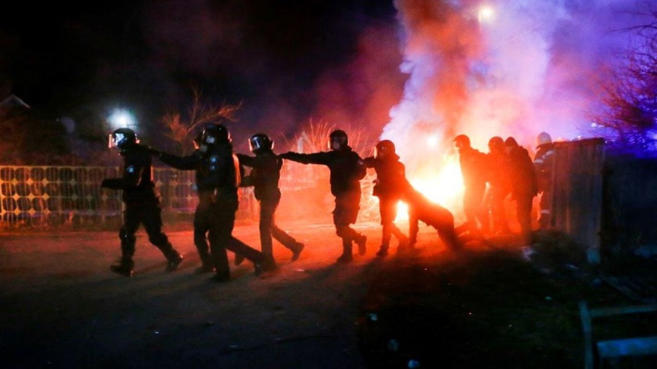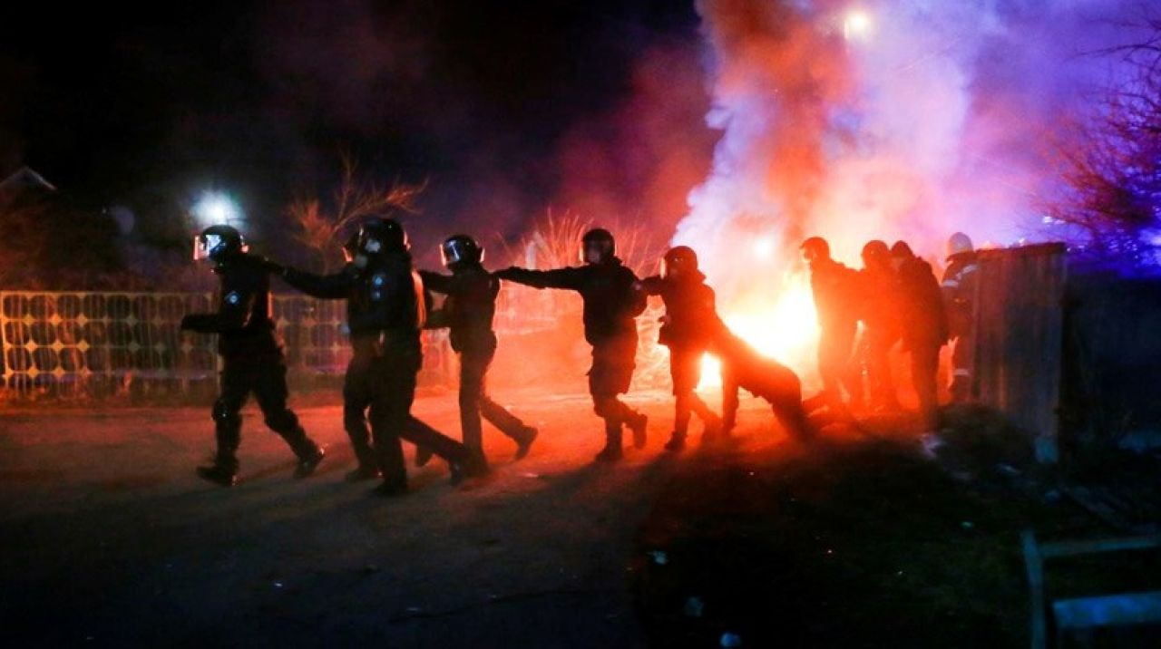 Söz konusu 72 kişinin havaalanından 7 otobüsle Poltava bölgesi Novie Sanjarı kentindeki bir sağlık merkezine nakledilişi sırasında bir grup Ukraynalı, otobüslerin şehre girişini engellemeye çalıştı.