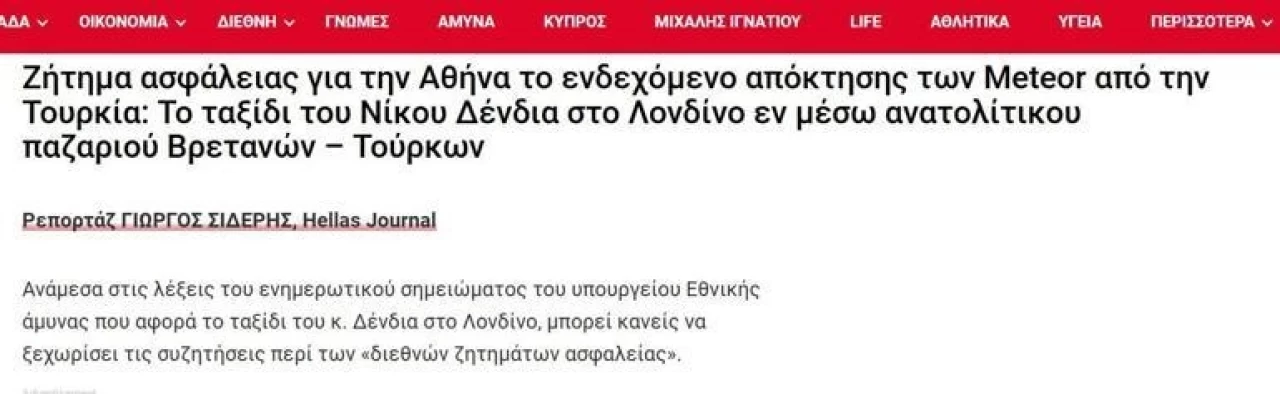 Yunan Hellas Journal ise "İngiliz-Türk pazarlıkları devam ederken, Dendias İngiltere'ye gidiyor" başlığı atarak "Yunanistan Savunma Bakanlığı’nın Nikos Dendias’ın Londra ziyaretine ilişkin bilgilendirme notundaki ifadeler arasında, 'uluslararası güvenlik meseleleri' konusundaki görüşmelerin öne çıktığı görülüyor" dedi. Journal ayrıca "Atina için, Türkiye’ye Meteor havadan havaya füzelerinin olası satışı ciddi bir güvenlik meselesi teşkil ediyor. Bu satışın gerçekleşmesi, toplamda 40 adet Eurofighter Typhoon savaş uçağının Türkiye’ye verilmesine nihai onayın çıkmasına bağlı olacak" notu düştü.