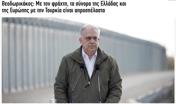 Iefimerida gazetesi ise, Yunanistan İçişleri Bakanı Takis Theodorikakos'in Türkiye'yi hedef alan sözlerine yer verdi. Theodorikakos'in "Bu duvar sayesinde Yunanistan'ın ve Avrupa'nın sınırları Türkiye için ulaşılamaz olacak" sözlerini öne çıkaran Yunan gazete, duvar projesinin yasa dışı göçmenlere değil Türkiye'yi hedef aldığını bir kaz daha gözler önüne serdi.