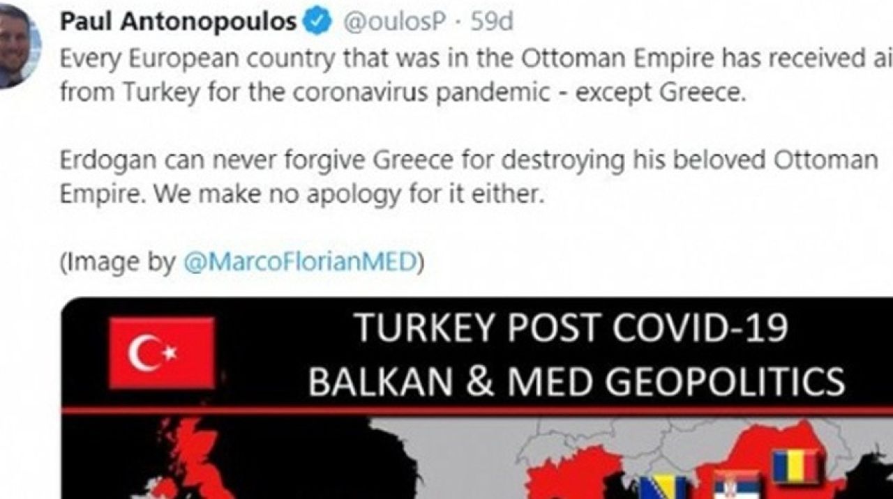 Türkiye'nin insani yardımı ise Yunan gazetecinin zoruna gitti. Twitter hesabı üzerinden Türkiye'nin yardım ettiği ülkeleri gösteren bir görsel paylaşan gazeteci Paul Antonopoulos, 'Osmanlı İmparatorluğu içindeki her Avrupa ülkesi -Yunanistan hariç- koronavirüs salgını için Türkiye'den yardım teslim aldı. Erdoğan, Osmanlı İmparatorluğu'nu yok ettiği için Yunanistan'ı asla affedemez. Bunun için özür de dilemiyoruz' şeklinde küstah ifadeler kullandı.