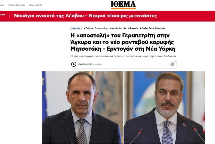 Yunan Proto Thema'da yer alan haberde, Dışişleri Bakanı Hakan Fidan ile Yunanistan Dışişleri Bakanı Yorgo Gerapetritis'in 5 Eylül'de yapacağı görüşmenin dönüm noktalarını tanımlamak için önemli olduğuna dikkat çekildi.