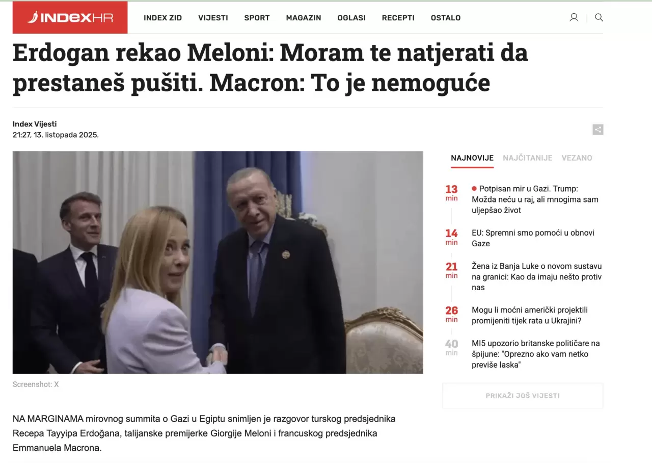 Cumhurbaşkanı Recep Tayyip Erdoğan, Mısır'ın Şarm Eş-Şeyh kentinde düzenlenen Gazze konulu Barış Zirvesi marjında İtalya Başbakanı Giorgia Meloni ile bir araya geldi. Erdoğan'ın görüşme sırasında İtalyan lidere esprili bir dille sigarayı bırakma tavsiyesinde bulunması, İtalyan ve dünya basınında geniş bir şekilde yer aldı.