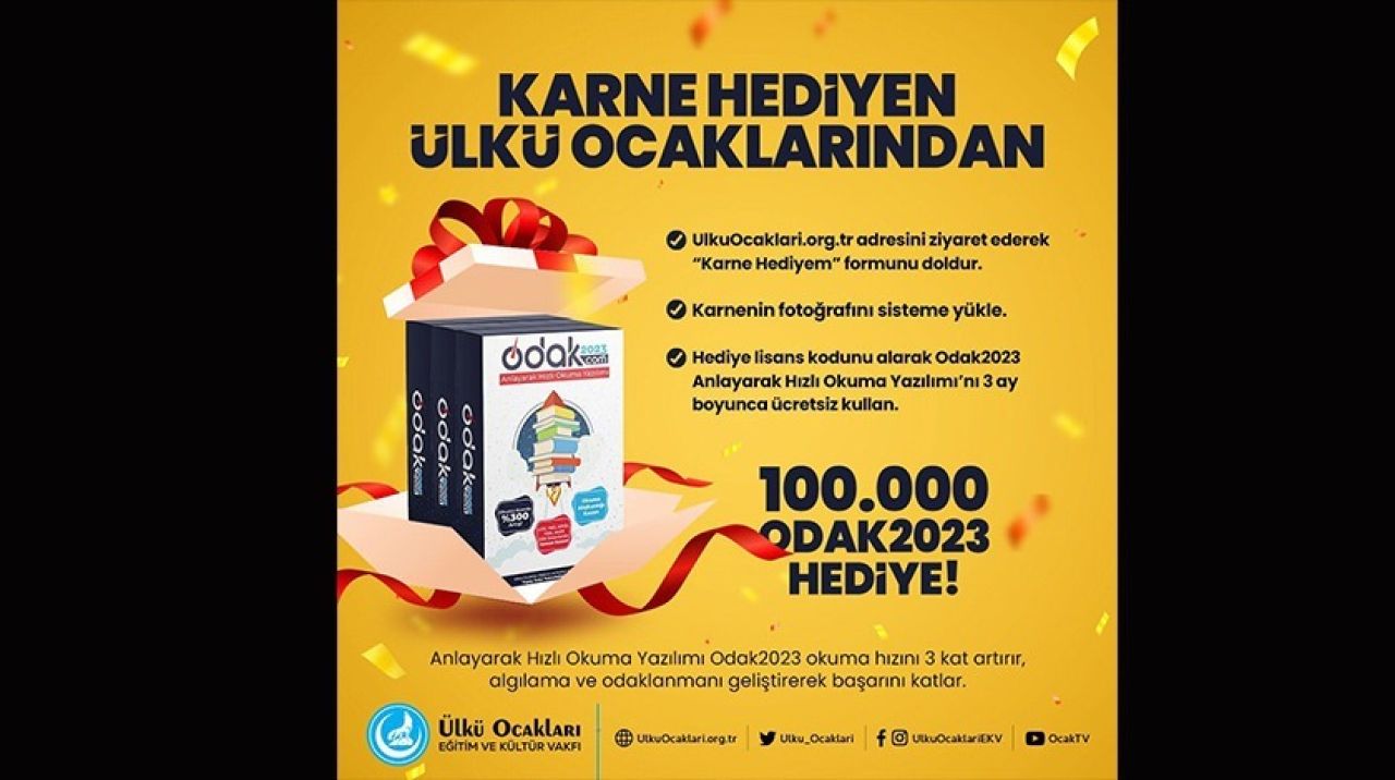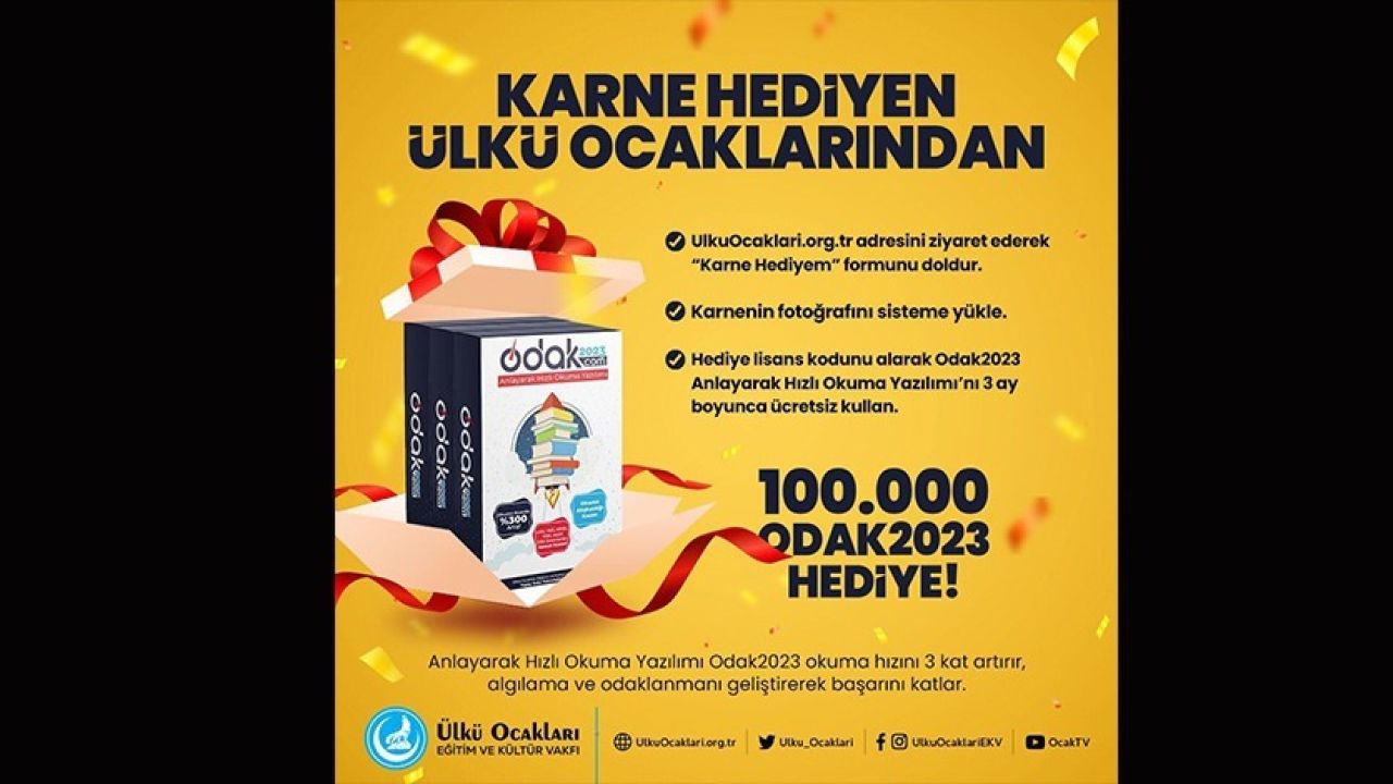 Ülkü Ocakları bu hediye vasıtasıyla öğrencilerin hem tatillerini verimli geçirmesi hedefliyor hem de yeni dönem eğitim öğretim hayatında başarılı olmaları için bir adım olarak planlanıyor. Bu kapsamda ise tam 100 bin öğrenciye ODAK2023 Anlayarak Hızlı Okuma yazılımı hediye edilecek.