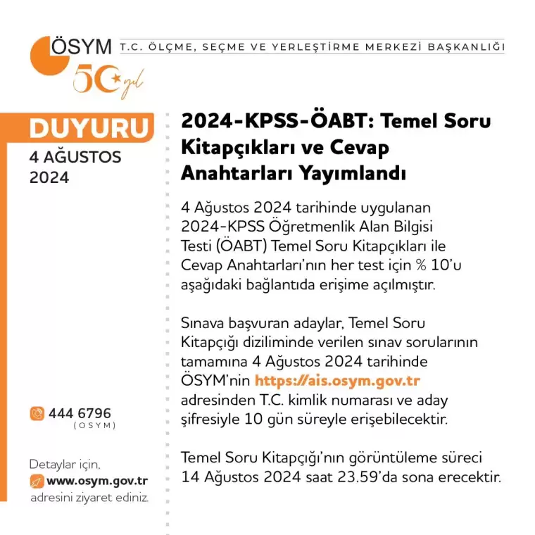 Öğrenci Seçme ve Yerleştirme Merkezi (ÖSYM), 4 Ağustos 2024 tarihinde uygulanan 2024-KPSS Öğretmenlik Alan Bilgisi Testi (ÖABT) Temel Soru Kitapçıkları ile Cevap Anahtarları'nın yayımlandığını bildirdi. ÖSYM'nin sosyal medya hesabı 'X' ten yapılan açıklamada, "Her test için % 10'u aşağıdaki bağlantıda erişime açılmıştır. Sınava başvuran adaylar, Temel Soru Kitapçığı diziliminde verilen sınav sorularının tamamına 4 Ağustos 2024 tarihinde ÖSYM'nin https://ais.osym.gov.tr adresinden T.C. kimlik numarası ve aday şifresiyle 10 gün süreyle erişebilecektir. Temel Soru Kitapçığı'nın görüntülenme süreci 14 Ağustos 2024 saat 23.59'da sona erecektir" ifadeleri kullanıldı.