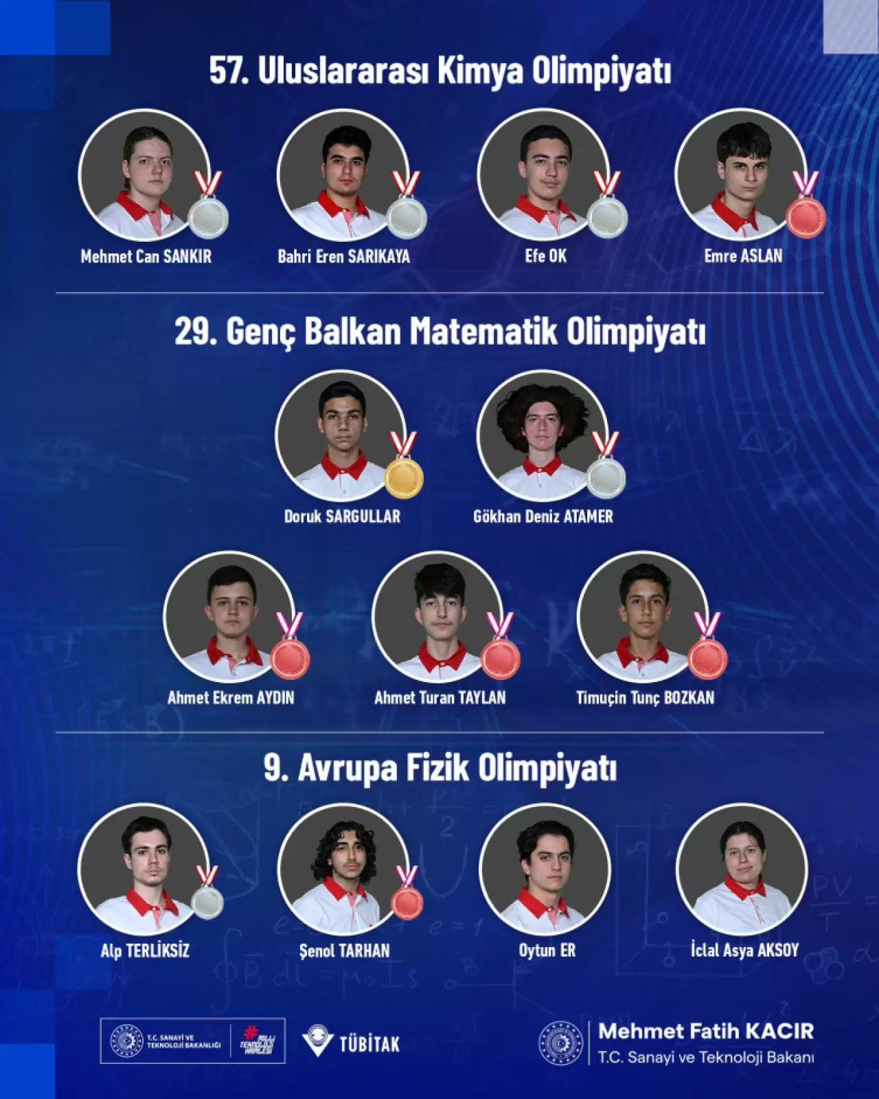 Olimpiyatta gösterdikleri başarı ile Ankara Fen Lisesi öğrencisi Mehmet Can Sankır, İzmir Fen Lisesi öğrencileri Bahri Eren Sarıkaya ile Efe Ok gümüş, Eyüpsultan Anadolu Lisesi öğrencisi Emre Aslan ise bronz madalyayı elde etti.