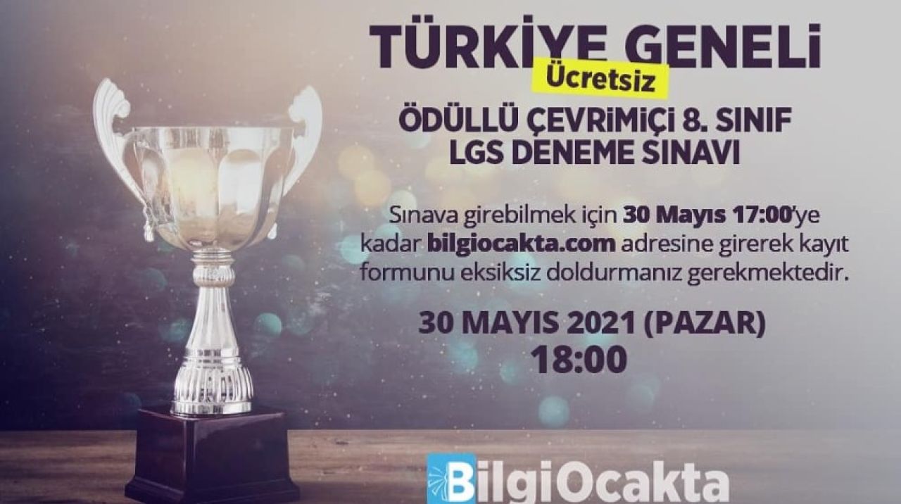 Türkiye'nin en büyük çevrimiçi ödüllü LGS deneme sınavı yarın 18.00'de başlıyor. Sınava katılım için bilgiocakta.com'a üye olarak sitedeki formu eksiksiz doldurmanız gerekmektedir. Cevaplarınızı sınav esnasında olası teknik arızalara karşı not etmeyi unutmayınız. Türkiye'nin en büyük çevrimiçi ödüllü LGS deneme sınavı yarın 18.00'de başlıyor. Sınava katılım için bilgiocakta.com'a üye olarak sitedeki formu eksiksiz doldurmanız gerekmektedir. Cevaplarınızı sınav esnasında olası teknik arızalara karşı not etmeyi unutmayınız.