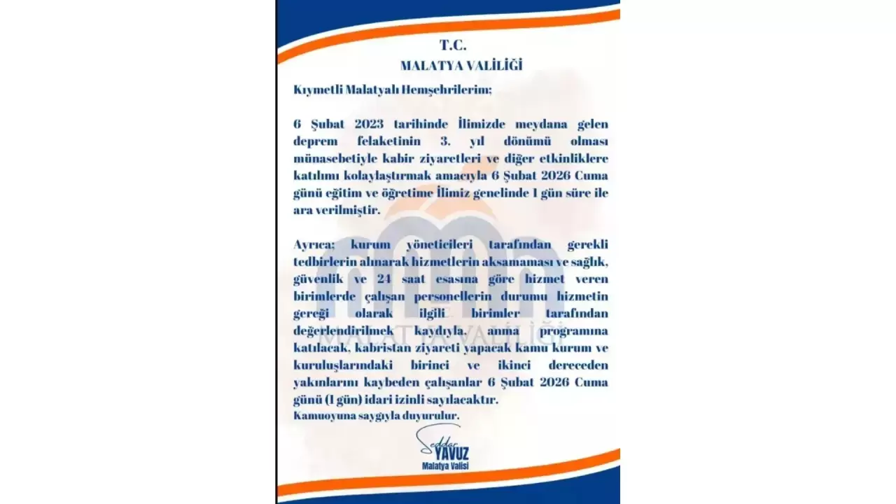 6 Şubat 2023 tarihinde İlimizde meydana gelen deprem felaketinin yıl dönümü olması münasebetiyle kabir ziyaretleri ve diğer etkinliklere katılımı kolaylaştırmak amacıyla 6 Şubat 2026 Cuma günü eğitim ve öğretime İlimiz genelinde 1 gün süre ile ara verilmiştir.
