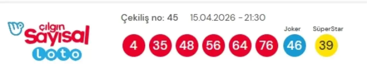 Milli Piyango Online üzerinden canlı olarak yayınlanan ve milyonların takip ettiği Çılgın Sayısal Loto çekilişi, 15 Nisan 2026 Çarşamba akşamı saat 21:30'da noter huzurunda tamamlandı. Dev ikramiye tutarıyla hayalleri süsleyen çekilişte, şanslı rakamlar resmi olarak duyuruldu. Peki, 165 Nisan Sayısal Loto sonuçlarında hangi numaralar çıktı? Joker ve SüperStar numaraları hangileri oldu? İşte 45. çekilişin tüm detayları!
