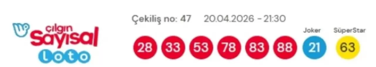 Sisal Şans tarafından 20 Nisan 2026 Pazartesi günü saat 21.30'da gerçekleştirilen Çılgın Sayısal Loto çekilişinde kazandıran numaralar: 28, 33, 53, 78, 83, 88 oldu. Gecenin Joker sayısı 21, SüperStar numarası ise 63 olarak açıklandı. 100 milyon TL'yi aşan büyük ikramiye için bilet sorgulama işlemleri millipiyangoonline.com üzerinden yapılabiliyor.