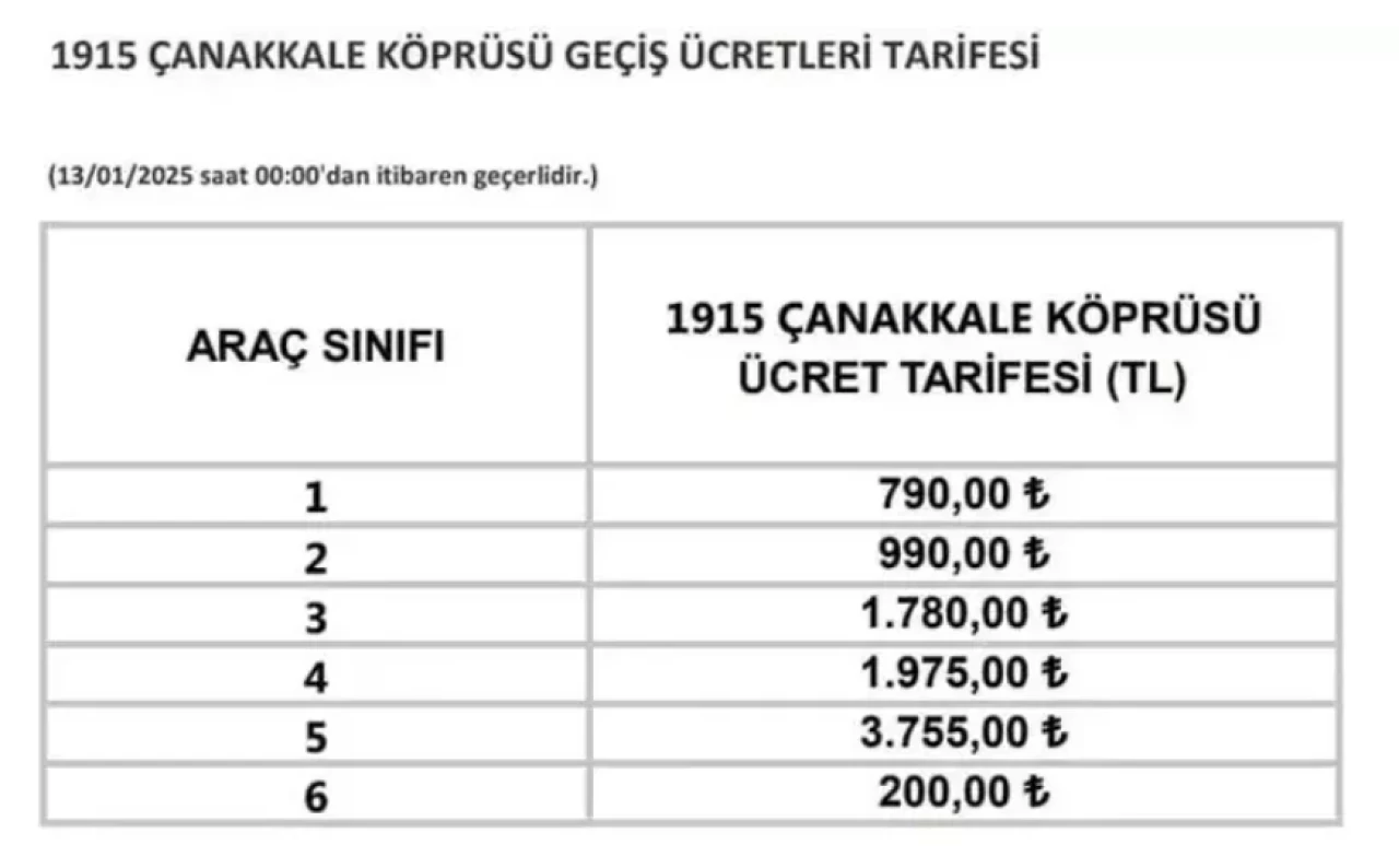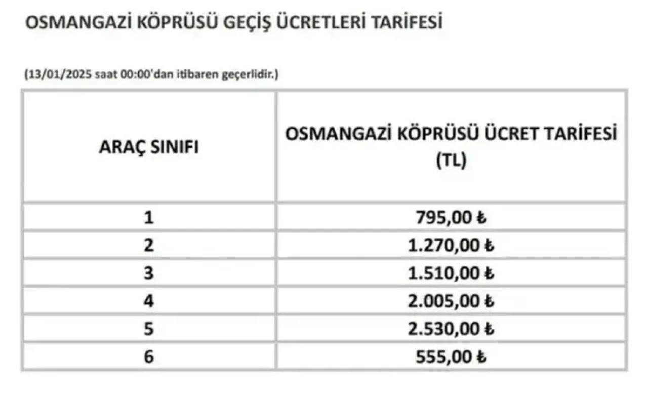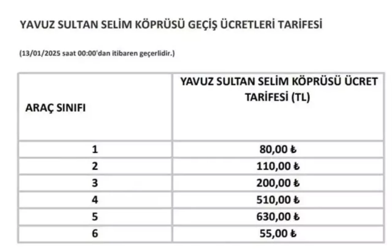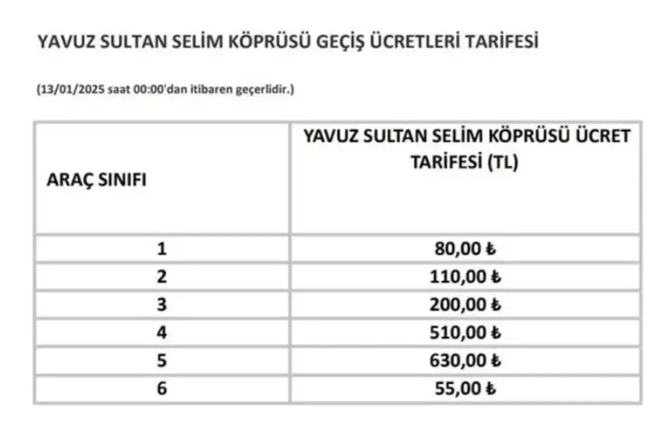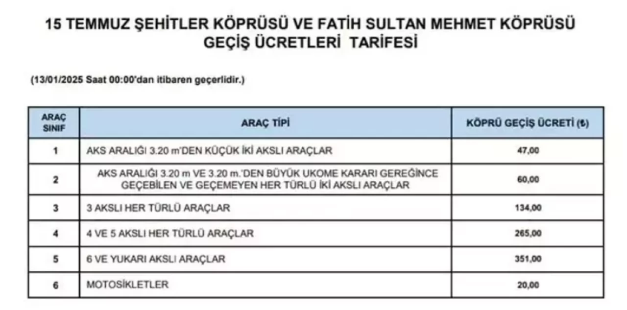 Yavuz Sultan Selim Köprüsü’nde zam oranı %15, Fatih Sultan Mehmet ve 15 Temmuz köprülerinde ise %42 olarak belirlenirken, Osmangazi Köprüsü’ndeki artış %42.3, Çanakkale Köprüsü’ndeki zam ise %35 olarak açıklandı.