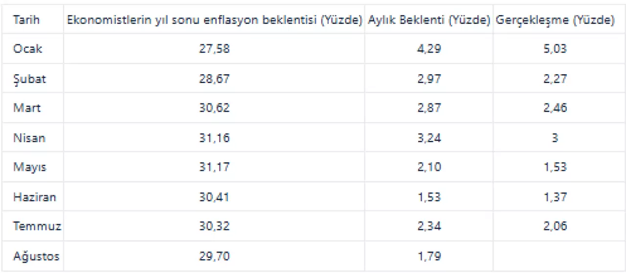Öte yandan, ekonomistlerin 2025 sonu enflasyon beklentisi ağustos ayı itibarıyla yüzde 29,70 oldu.