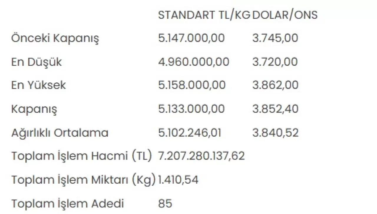 KMKTP'de altında toplam işlem hacmi 7 milyar 207 milyon 280 bin 137,62 lira, işlem miktarı ise 1410,54 kilogram oldu.