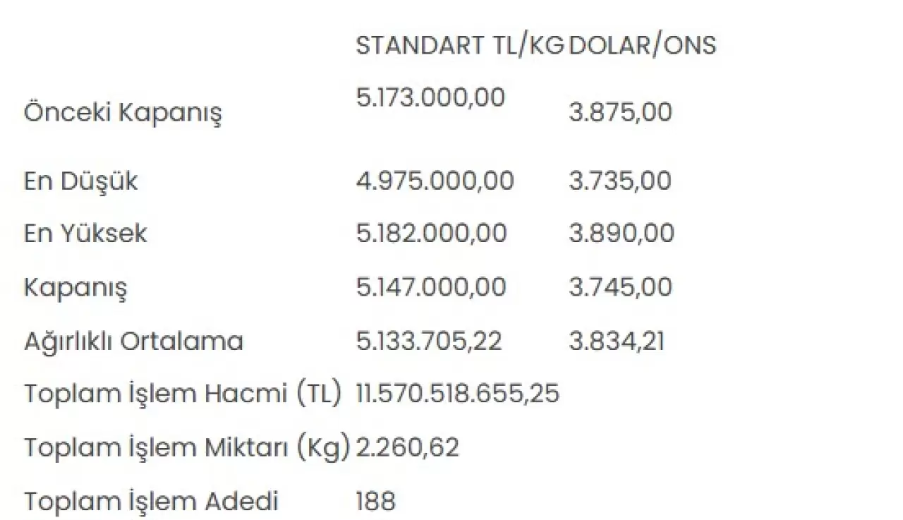 KMKTP'de altında toplam işlem hacmi 11 milyar 570 milyon 518 bin 655,25 lira, işlem miktarı ise 2 bin 260,62 kilogram oldu.