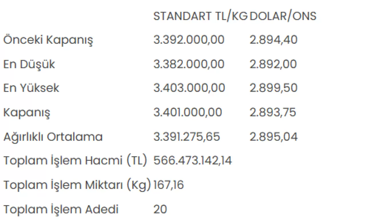 KMKTP'de altında toplam işlem hacmi 566 milyon 473 bin 142,14 lira, işlem miktarı ise 167,16 kilogram oldu.