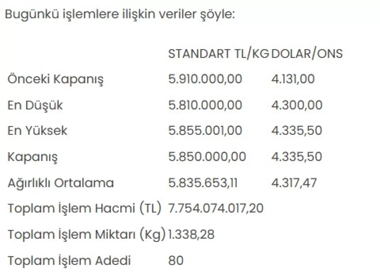 KMKTP'de altında toplam işlem hacmi 7 milyar 754 milyon 74 bin 17,20 lira, işlem miktarı ise 1338,28 kilogram oldu.