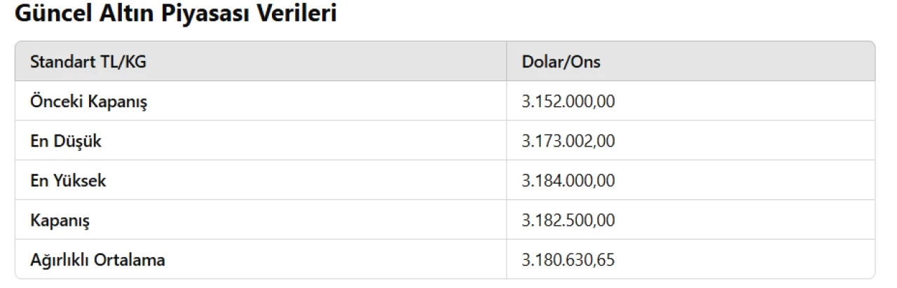 Altın piyasasında gün içinde en düşük 3 milyon 173 bin 2 lira, en yüksek 3 milyon 184 bin lira seviyeleri görüldü. Önceki gün kapanışı ise 3 milyon 152 bin lira olarak gerçekleşmişti.
