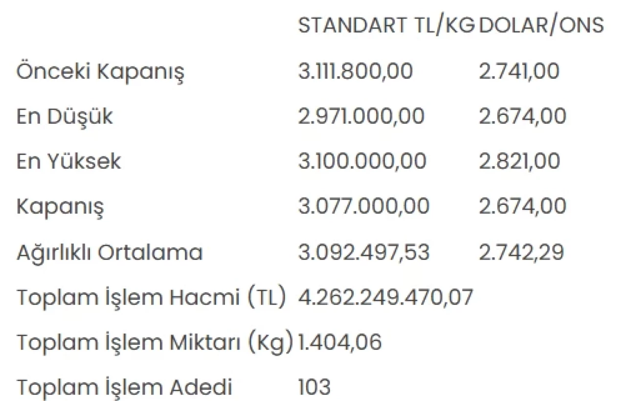 KMKTP'de altında toplam işlem hacmi 4 milyar 262 milyon 249 bin 470,07 lira, işlem miktarı ise 1.404,06 kilogram oldu.