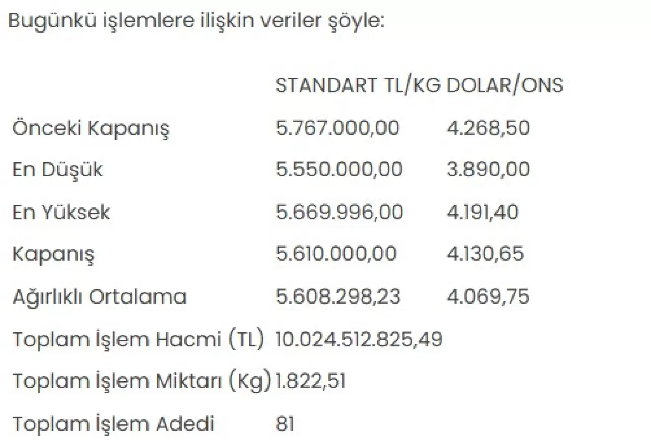 KMKTP verilerine göre, altın piyasasında toplam işlem hacmi 10 milyar 24 milyon 512 bin 825,49 lira, işlem miktarı ise 1.822,51 kilogram olarak gerçekleşti. Tüm metallerdeki toplam işlem hacmi ise 11 milyar 856 milyon 169 bin 720,61 lira oldu.