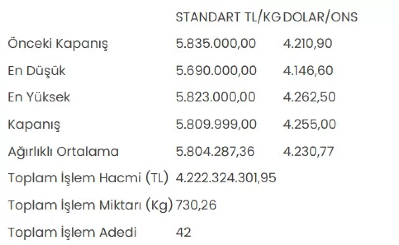 KMKTP'de altında toplam işlem hacmi 4 milyar 222 milyon 324 bin 301,95 lira, işlem miktarı ise 730,26 kilogram oldu.