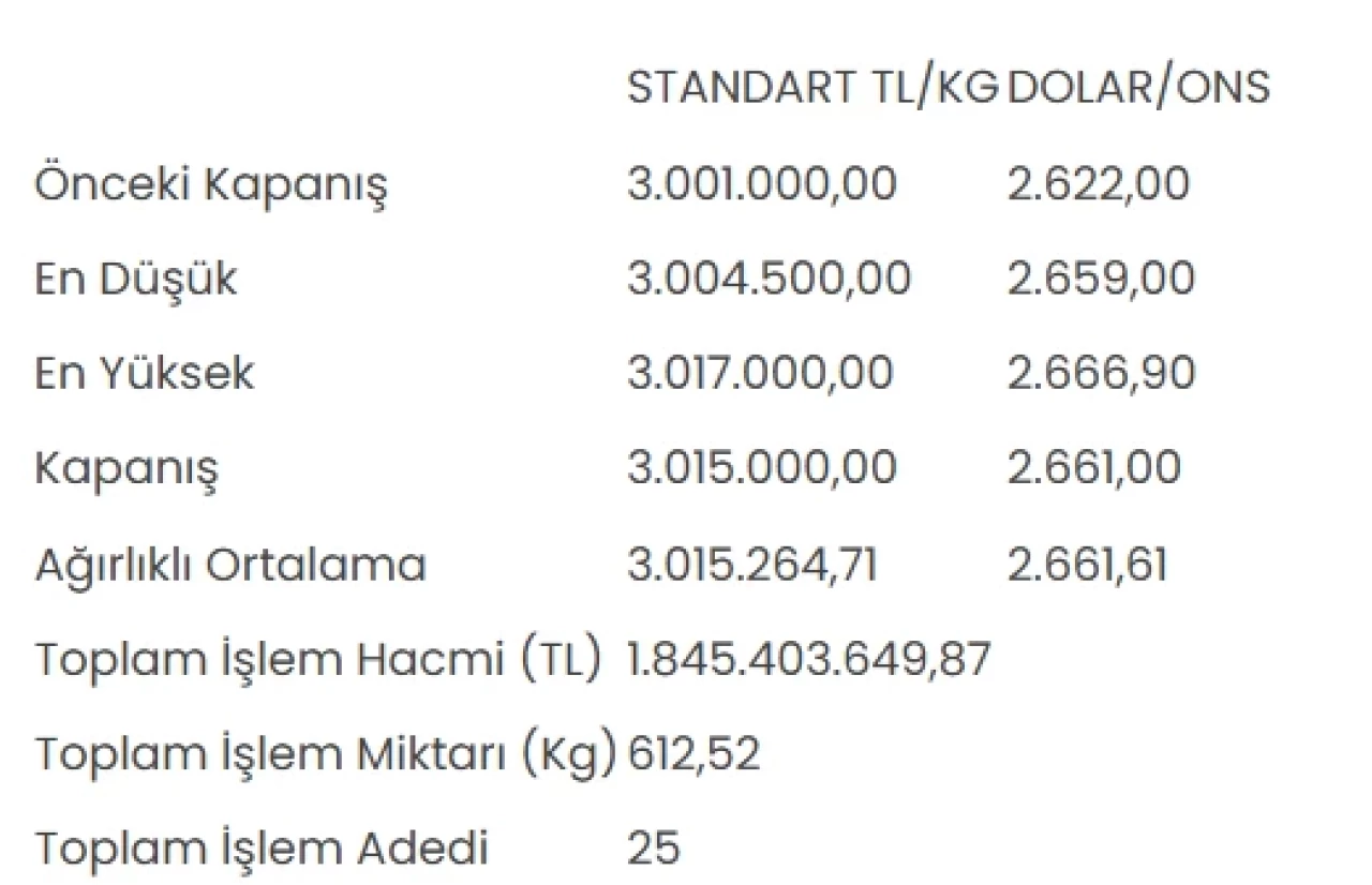 Borsa İstanbul Kıymetli Madenler ve Kıymetli Taşlar Piyasası'nda (KMKTP) standart altının kilogram fiyatı, yüzde 0,5 artışla 3 milyon 15 bin liraya ulaştı. Dün günü 3 milyon bin liradan tamamlayan altın fiyatları, bugünkü işlemlerde en düşük 3 milyon 4 bin 500 lira, en yüksek ise 3 milyon 17 bin lira seviyesini gördü.