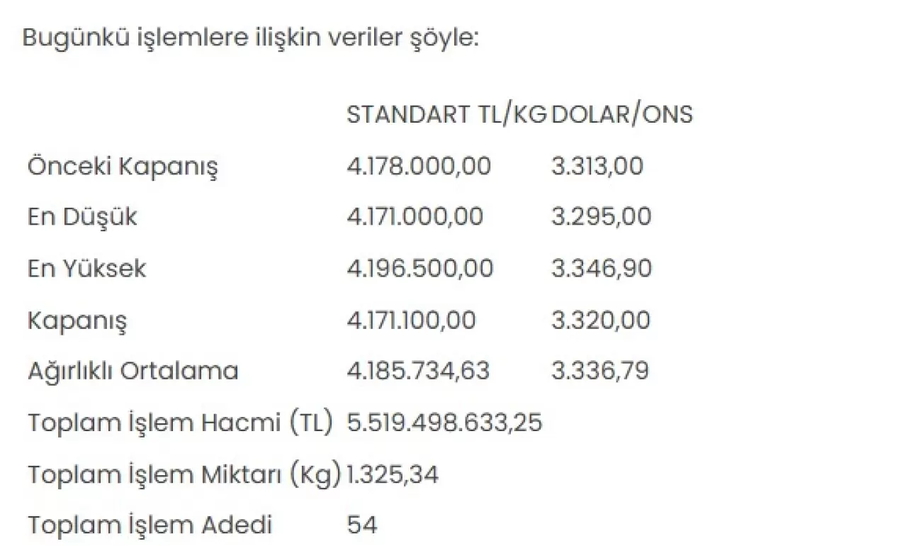 Dolar/ons cinsinden ise altının en düşük seviyesi 3.295, en yüksek seviyesi 3.346,90 olarak kaydedilirken, kapanış fiyatı 3.320 dolar oldu. Ağırlıklı ortalama ise 3.336,79 dolar/ons seviyesinde gerçekleşti.