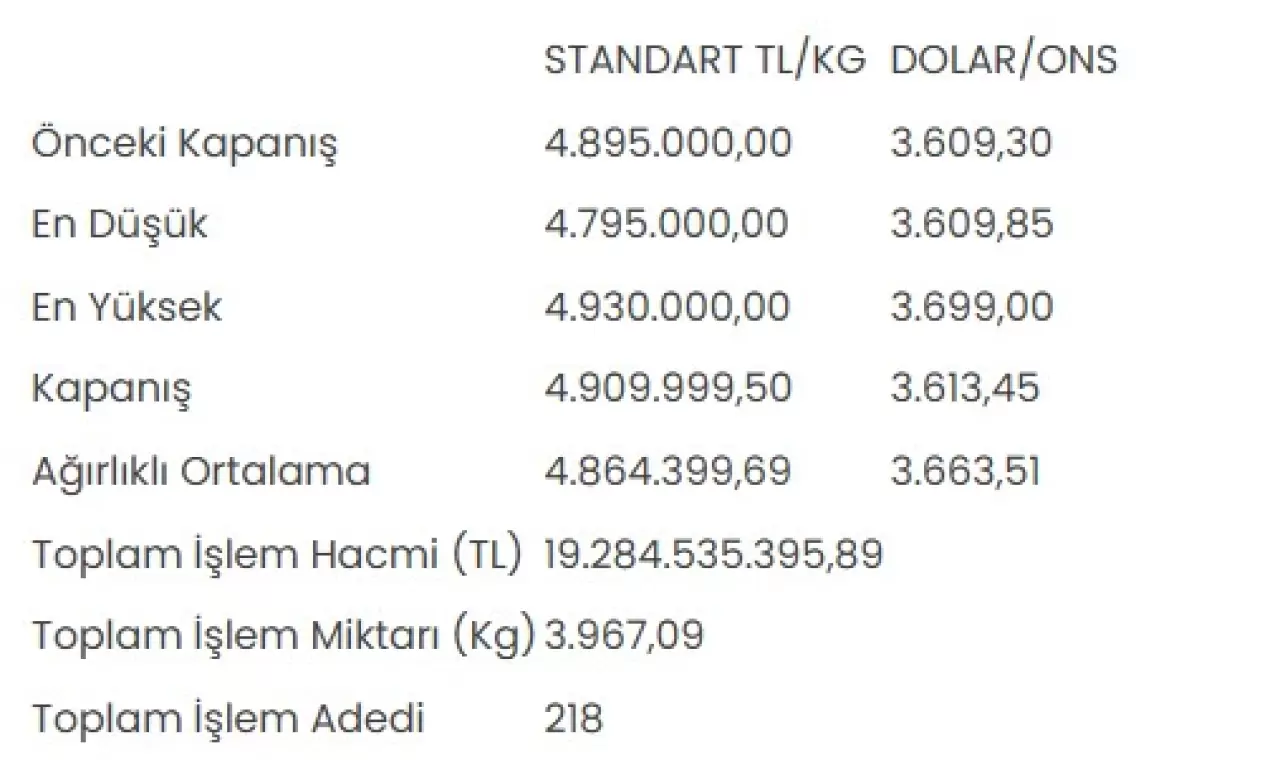 KMKTP'de altında toplam işlem hacmi 19 milyar 284 milyon 535 bin 395,89 lira, işlem miktarı ise 3 bin 967,09 kilogram oldu.