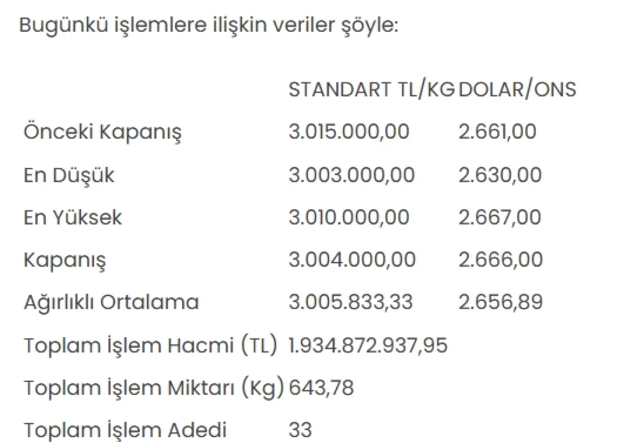 Borsa İstanbul Kıymetli Madenler ve Kıymetli Taşlar Piyasası (KMKTP) altın piyasasında önemli bir düşüş yaşandı. Dün 3 milyon 15 bin liradan kapanan standart altının kilogram fiyatı, bu sabah itibariyle yüzde 0,4 oranında bir azalma ile 3 milyon 4 bin liraya geriledi.