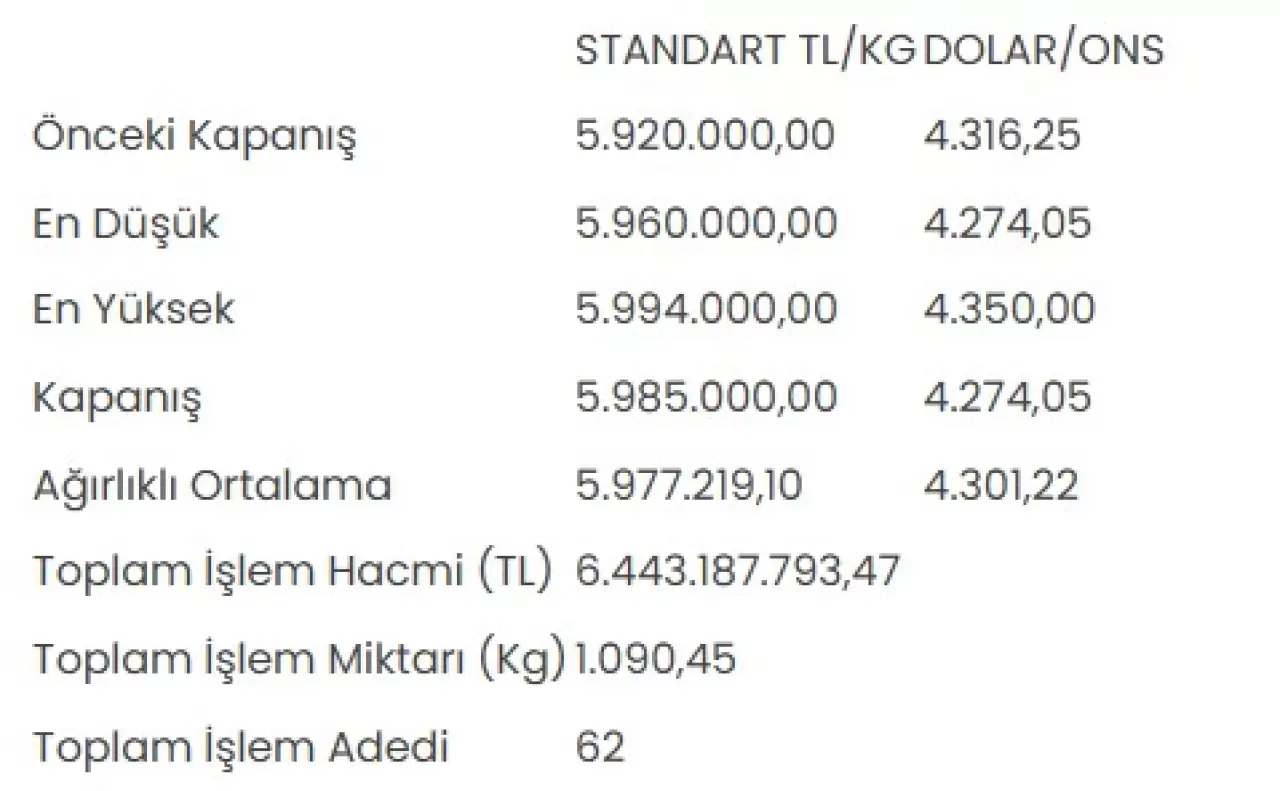 Standart altının kilogram fiyatı, bir önceki işlem gününü 5 milyon 920 bin liradan tamamlamıştı.