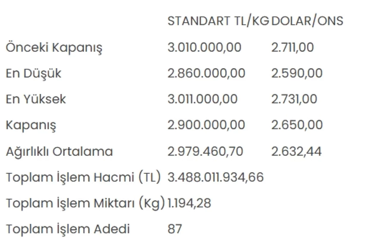 KMKTP'de altında toplam işlem hacmi 3 milyar 488 milyon 11 bin 934,66 lira, işlem miktarı ise 1.194,28 kilogram oldu.