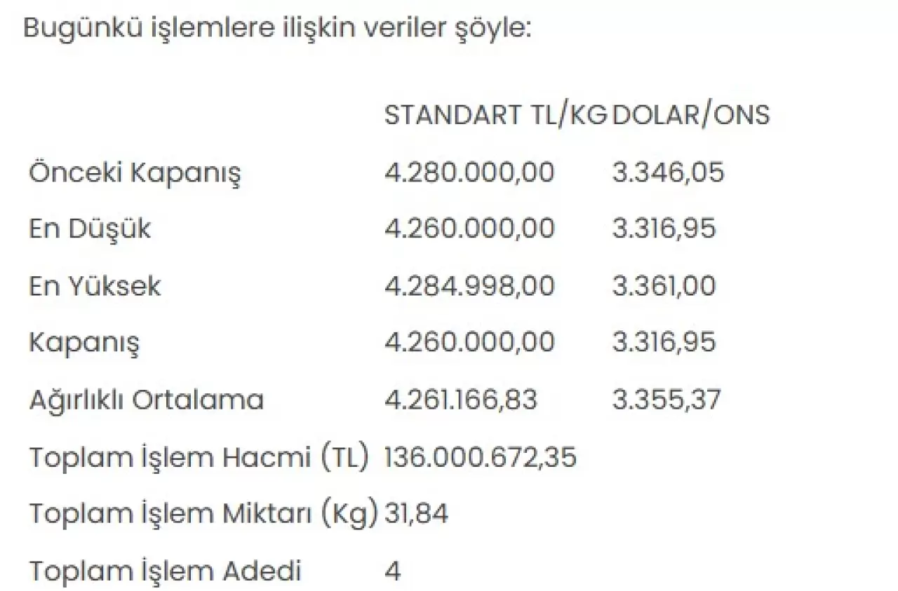 KMKTP'de altında toplam işlem hacmi 136 milyon 672,35 lira, işlem miktarı ise 31,84 kilogram oldu.