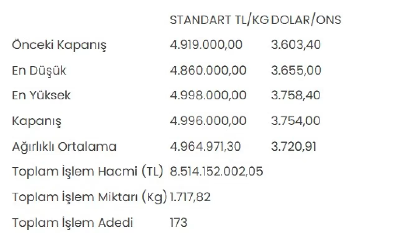 Tüm metallerde toplam işlem hacmi ise 8 milyar 948 milyon 873 bin 584,32 lira olarak gerçekleşti.