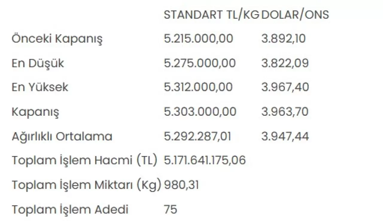 Borsa İstanbul Kıymetli Madenler ve Kıymetli Taşlar Piyasası'nda (KMKTP) standart altının kilogram fiyatı, günün sonunda 5 milyon 303 bin liraya çıktı.