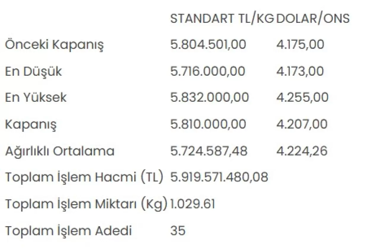 Tüm metallerdeki toplam işlem hacmi ise 5 milyar 953 milyon 499 bin 494,27 liraya ulaştı.