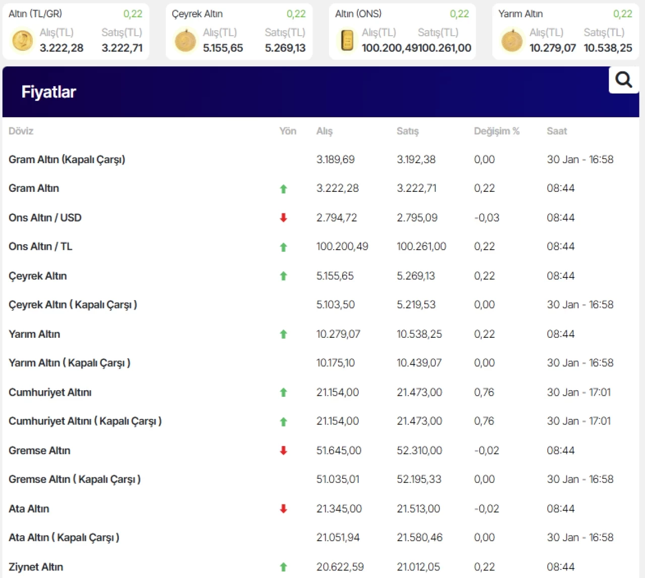 - Çeyrek altın: 5.256 TL’ye yükseldi.