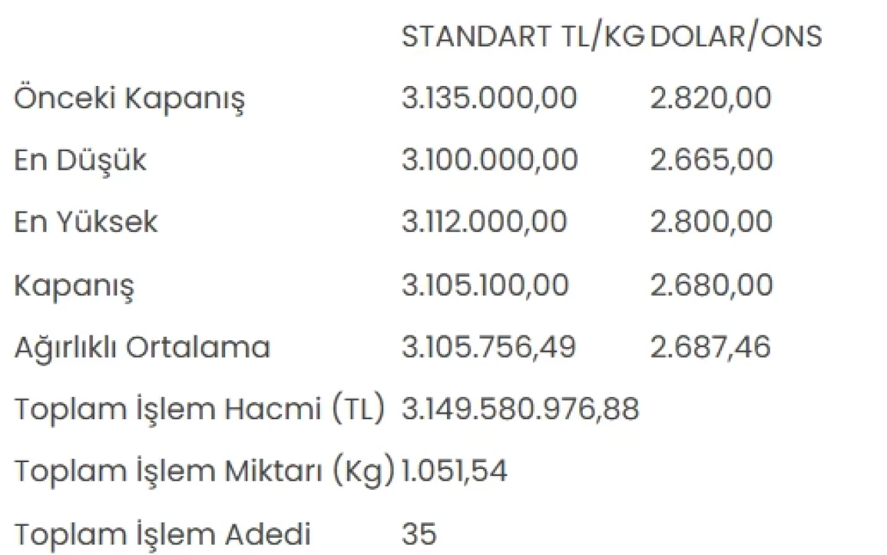 Borsa İstanbul Kıymetli Madenler ve Kıymetli Taşlar Piyasası'nda (KMKTP) standart altının kilogram fiyatı 3 milyon 105 bin 100 liraya geriledi.