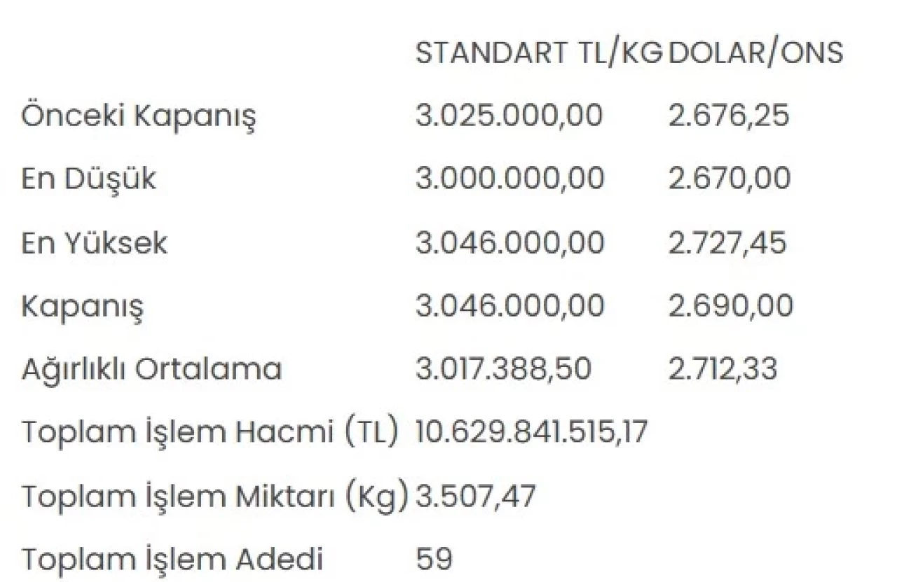 KMKTP'de altında toplam işlem hacmi 10 milyar 629 milyon 841 bin 515,17 lira, işlem miktarı ise 3.507,47 kilogram oldu.