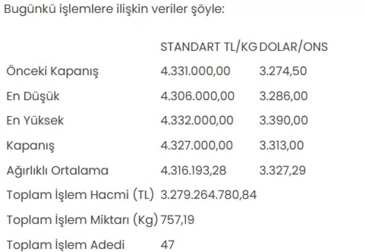 Altın piyasasında en düşük 4 milyon 306 bin lira, en yüksek 4 milyon 332 bin lirayı gören standart altının kilogram fiyatı, günün sonunda yüzde 0,1 azalışla 4 milyon 327 bin lira oldu.