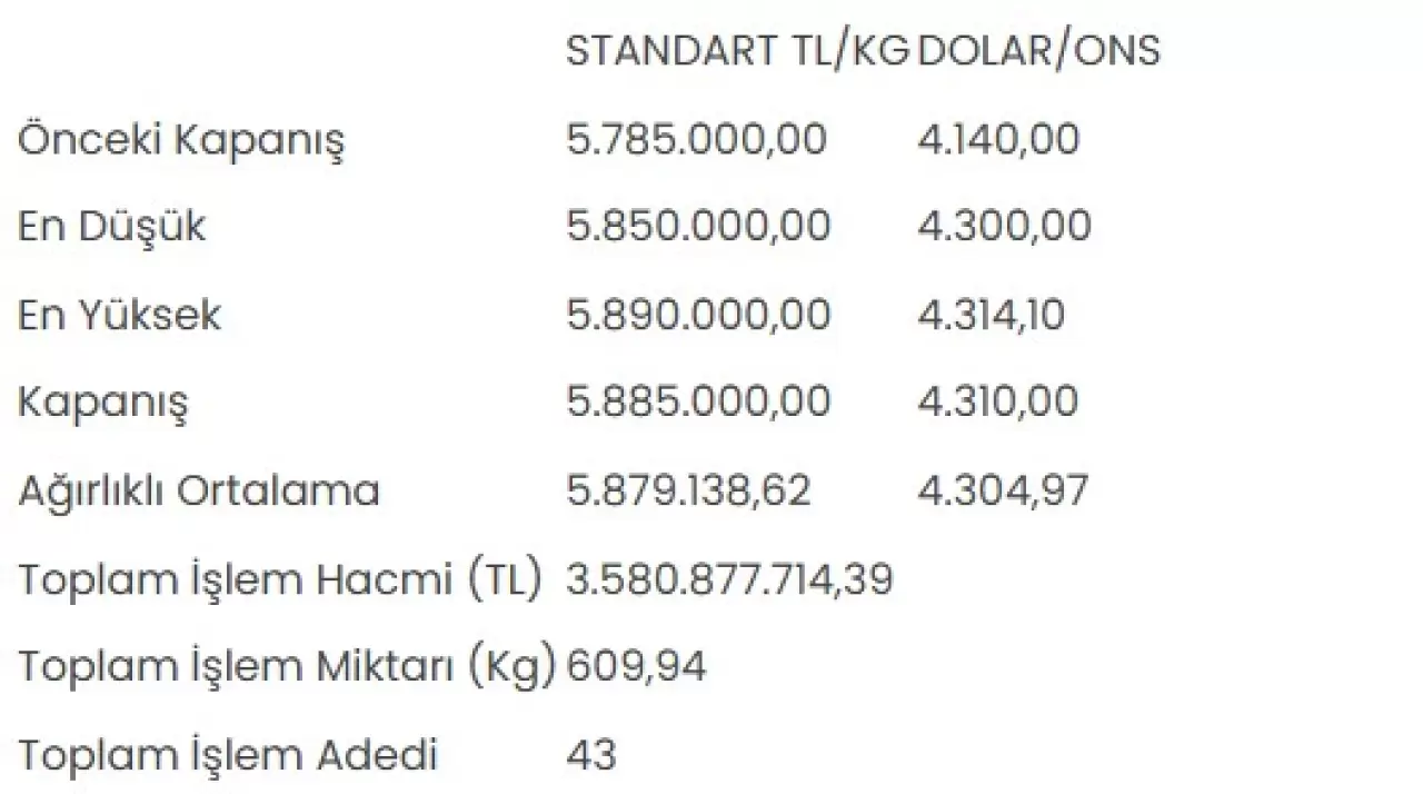 KMKTP'de altında toplam işlem hacmi 3 milyar 580 milyon 877 bin 714,39 lira, işlem miktarı ise 609,94 kilogram oldu.